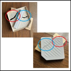 表裏の様子です。なお、2枚目に示す様に、赤丸箇所では、表も目立ちません。青丸箇所は、完全に割れたので、これが限界でした。なお、補強材もあるので、修理前よりも、頑丈になりました。