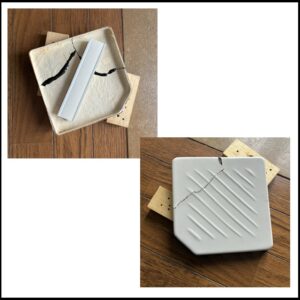 具体的な修理手順です。割れた面に少量を塗ります。蓋と蓋を合わせて、両手でしっかりと押さえつけます。初期硬化まで、数十分なので、少なくとも、5分以上は、ずれないように、お願いします。なお、裏の接着面が少し多めかもしれません。表は、拭きとって、接着剤のはみ出しは、無しです。一箇所が終われば、次の箇所となります。