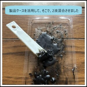 ・2枚目に示す様に、製品ケースを活用して、そこで、2液混合させました。使用後は、硬化しているので、そのまま、製品ケースとして使用して、次の機会まで保管です。うちでは、冷蔵庫保管にしたので、数年後でも使用可能でした。