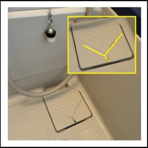 「お風呂のプラスチック排水蓋」の修理後の様子です。ヒビが三本です。ヒビの跡は、残っていますが、接合されています。
