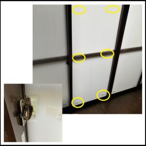 ・「背の高さ位の窓」であれば、「両面テープ」は、6か所です(中央部もお願いします)。左下に示す様に、「窓のロック」部分は、「3cm×6cm」でくり抜きました(くり抜かないと、ロックできないので)。