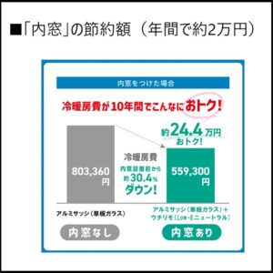 「窓の断熱」の色々です。例えば、関連記事「断熱性の高い窓(内窓)を採用」によると、「内窓(二重窓)」では、年間で約2万円の節約額となります。