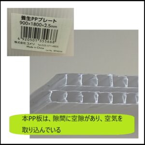 ・近所のホームセンターでは、「PP板、1800×900×2.5mm、10枚、2000円弱」でしたので、うちでは、こちらで購入しました。なお、2枚目に示す様に、本PP板は、隙間に空隙があり、空気を取り込んでいるのも、メリット大です。