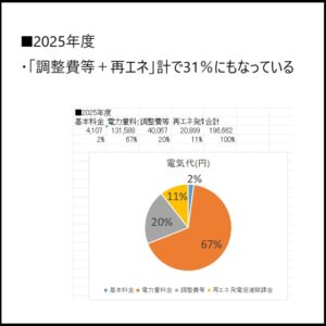 ・以下に示す様に、電気代の内訳では、「調整費等+再エネ」計で31%にもなっており、今後の上昇が不安要素です。