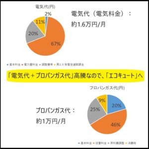 ・ポイントは、「エコキュート」導入により「プロパンガス代」無しです。加えて、「電気代」の安い契約も可能です。なお、「我が家の築年数が古く、60代である事も考慮」した結果です。
