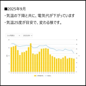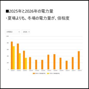 ・前者「電気代(電気料金):約1.6万円/月」は、「エバーグリーン・リテイリング」と契約中です。以下が、2025年度(最近1年間)の電気代の実態です。夏場よりも冬場の方が、電気代が倍程度です。2024年度も同様な傾向でした。2枚目が昨年と比較した電力量です。