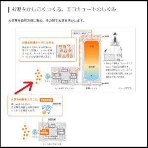 ・パナソニックHP「エコキュートのしくみ」より、エコキュートの仕組みを転記です。「大気中の熱を取り込む」が面白いです。