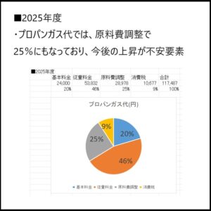 ・後者のプロパンガス代は、地元メーカーと契約中です。以下の様に、夏場よりも冬場の方が、プロパンガス代が倍程度です。2枚目に示す様に、プロパンガス代の内訳では、原料費調整で25%にもなっており、今後の上昇が不安要素です。