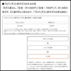 ・参考記事「プロパンガス使用量から都市ガス料金算出」では、本観点に触れて頂いており、都市ガスメーカー様が正確な記載です。要するに、「プロパンガスよりも都市ガスの方が、約2.2倍のガス量の差」です。これらを考慮すると「プロパンガスと都市ガスの差は、微妙」となります。