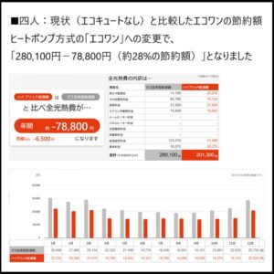 現状(電気+プロパンガス)に対して、「エコワン」導入で、光熱費(電気代+プロパンガス代)が20%以上が達成できると考えています。つまり、「電気代(電気料金):約1.6万円/月、年間で20万円弱」+「プロパンガス代:約1万円/月、年間で約12万円」を起点とすると、32万円×20%以上=6.4万円以上の節約額なります。
