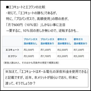 エコキュートは、「オール電化の深夜料金」がポイントです。ただ、近年、本メリットが揺らいでおり、特に、沢山のガスを使う「冬場」では、「圧倒的に、エコワンの勝ち」となる試算結果もあります。