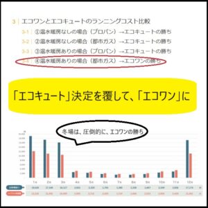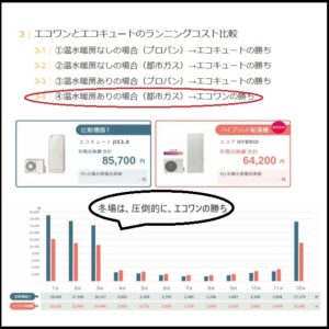※特徴的なのは、以下の様に、沢山のガスをつかう「冬場」では、「圧倒的に、エコワンの勝ち」である試算結果です。読者の方も、衝撃的なデータだと存じます。