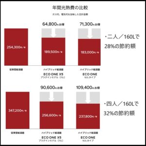 ・参考記事「【徹底比較】エコワンとエコキュートはどちらがお得なの?」(ノーリツ)では、本観点(給湯器部分のみの比較)に触れて頂いております。2022年と少し古いのですが、その当時から「エコワンの勝ち」が存在しています。2026年現在であれば、「エコワンの勝ちの範囲が広がっている」事が容易に類推できます。